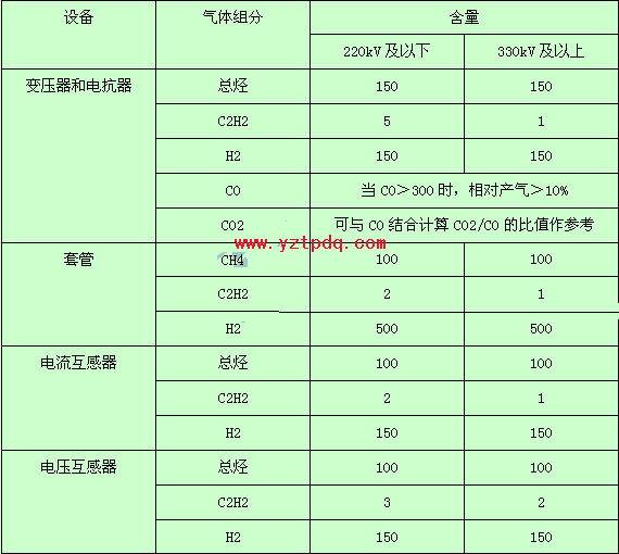 表2-3 運行中變壓器、電抗器和套管油中溶解氣體含量的注意值