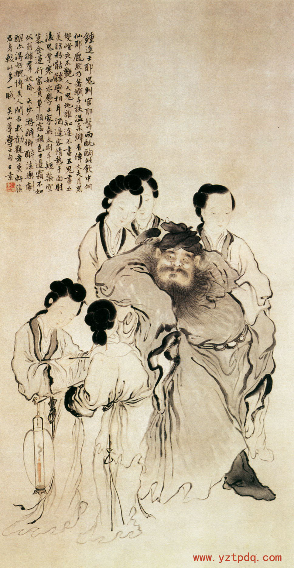 【鐘馗圖】描繪五仕女簇擁著酒醉的鐘馗夜歸的情景。鐘馗作張髯大腹、步履蹣跚之狀,雙目斜視,左右脅各有攙扶侍女一人,后側(cè)一侍女護送。侍女頭部發(fā)髻烏黑光亮,臉部敷脂抹粉,體態(tài)輕盈,衣褶飄逸。鐘馗寬袍束帶,以淡墨疾筆寫衣褶,作蘭葉描。人物畫法,以工帶寫。左上自錄吳山尊雜詩一章,詩意揭露世態(tài)炎涼,不如盡醉為樂。此畫是王素人物畫中的佳作。