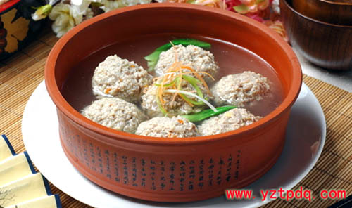 “獅子頭”,即揚州話說的“大斬肉”,北方話叫“大肉丸子”或“四喜丸子”。據(jù)說它的“遠祖”是南北朝《食經(jīng)》上所記載的“跳丸炙”(《齊民要術(shù).炙法第八十》)。