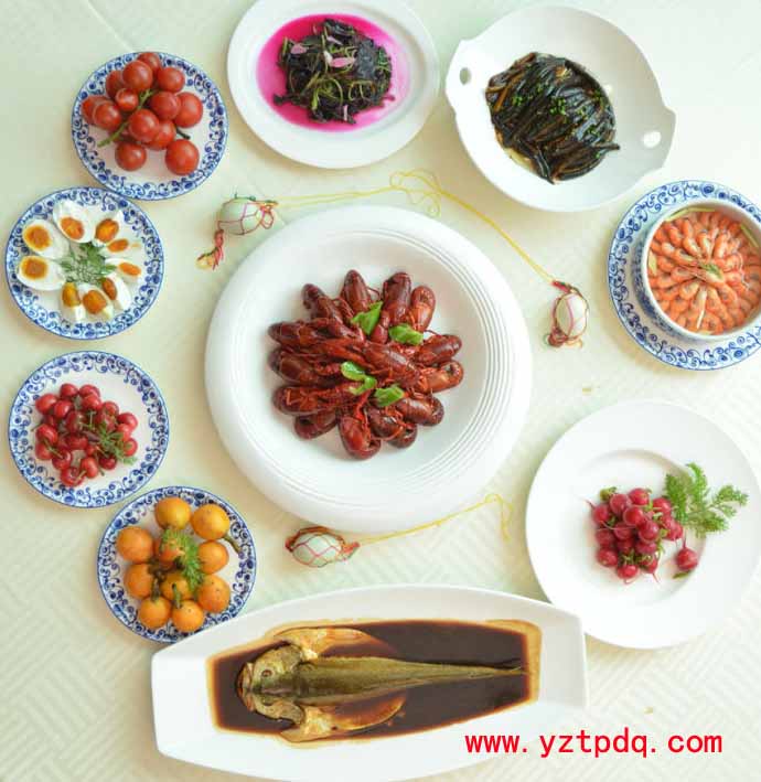每到端午節(jié)的這一天,揚(yáng)州人家中午一定要回家“嘗午”。所謂“嘗午”就是吃十二紅,是揚(yáng)州人過端午節(jié)特有的習(xí)俗。“十二紅”是指十二樣自然紅色,或經(jīng)烹調(diào)后顏色發(fā)紅的時令菜肴,通常有咸鴨蛋、煮黃魚、粉皮拌黃瓜、炒蝦子、炒紅莧菜、燒仔鵝、洋花蘿卜、櫻桃、枇杷、紅杏、干菜燒肉、炒長魚、紅燒扒蹄、火腿、香腸、雄黃酒等。一般分為4碗8碟,即4個涼拌,4個熱炒,4個燒菜。這個數(shù)字代表每年的十二個月,再者它也兼顧了每年的四時八節(jié)。